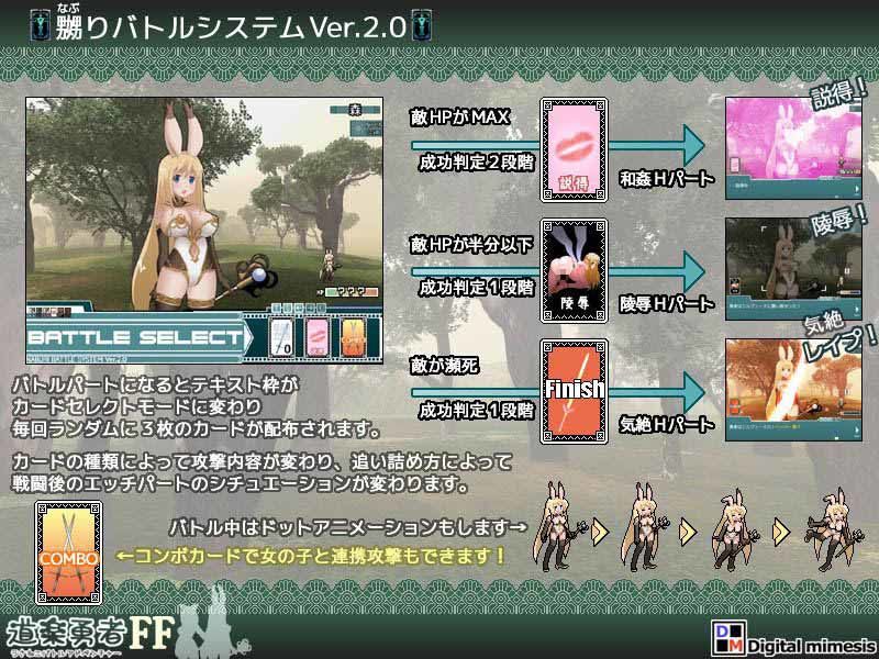 マホボテシリーズ第4弾! 新開拓エッチゲーム! 嬲りバトル+ムーブオンアドベンチャーシステムでさらに新しいエッチゲームのカタチへ! 即ボテ魔法マホボテが使える勇者の物語! ■ムーブオンアドベンチャーシステム 従来のアドベンチャーパートに移動と探索の自由度がUPしたシステムです。 要所だけを調べてイベントを起こして進むのもOK。すべての箇所を調べると キャラや設定や世界観に深みが出る新しい仕掛けです。釣りもできます。 ■嬲りバトルシステム Ver.2.0 バトルパートになるとテキスト枠がカードセレクトモードに変わり 毎回ランダムに3枚のカードが配布されます。 カードの種類によって攻撃内容が変わり、追い詰め方によって 戦闘後のエッチパートのシチュエーションが変わります。 コンボカードはルートによっては女の子と連携攻撃ができます! ■エッチパート 30フレームアニメーションでコーデック要らずで再生できます。 ■挿入システム エッチアニメパートに入ると冒頭に挿入システムがあります。 一定連打クリックすることで挿入時の抵抗や処女喪失などの反応が楽しめます。 ■マホボテシステム フィニッシュの選択肢は、3つ。 中出し、外出しは勿論、当サークルの最大のウリであるマホボテは 中出し後に即ボテにさせることができるオリジナルシステムです。 ■レジストエクスタシーシステム パイズリイベント時、射精を我慢する判定に成功すると フィニッシュシーンが変わります。 ■ストーリー 魔王軍の脅威に対抗するため勇者が考えた作戦は 一代で勇者の数を増やすことだった! 即ボテ魔法の「マホボテ」で妊娠させた後のエピソードが強化! 異世界に飛ばされた勇者は発情期を迎えた獣人娘達と出会う! 内訳:AEアニメ/嬲りバトル/ムーブオンアドベンチャー/BGM/SE 属性:ロリ/姉/妹/娼婦/パイズリ/和姦痴女/凌●調教/気絶レ●プ/淫語 兎獣人娘Hシーン 9(正常位4 後背位4 パイズリ1) 猫獣人娘Hシーン 9(正常位4 後背位4 パイズリ1) 褐色兎獣人娘Hシーン 8(正常位3 後背位4 パイズリ1) 2人同時マホボテHシーン 1 フィニッシュ差分計 34 CV 白黒魔道士シルヴェーヌ:大山チロル トレジャーハンターミア:綾奈まりあ 竜騎士クイニー:涼貴涼 約1200ボイス 隠しルートあり マルチエンディング フルスクリーン切り替えボタン ゲーム体験版は、序盤のバトルとエッチパートが楽しめますので 是非、プレイしてください。