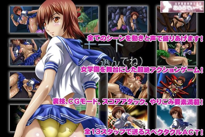 ■■■■■■■■■ JKアクション ■■■■■■■■■ ついにこの銃を手に取る時がきたのね…。いつかは来ると思ってたわ。 …そう、この女学園に異世界との結界があると知ってからは、常に覚悟していた。 今頃、私の友達はモンスターに襲われているはず…。一刻の猶予もないわ。 モンスターは女性の性器…いえ、マンコの奥に卵を産みつける為にこの世界に侵入してくるの。 鬼畜なモンスター…きっと容赦がない。触手やチンポで子宮をかき回すように犯し続ける。 イキまくって、アヘまくって、気が狂うまで犯●れ続ける。 女の私も例外じゃない…。 万が一倒れるようなことがあれば死ぬまでモンスターに犯●れ続けるわ。 でも、友達、この学園を救うためには戦うしかない。 さあ、行くわよ!! ■■■■■■■■■ アクション ■■■■■■■■■ 全13面、横スクロール型ガンアクションゲームです。 次々襲い来るモンスターをなぎたおして進んでいきます。 モンスターにやられると、そのモンスターによる凌●ムービーが表示されます。 操作はキーボードとジョイスティックに対応しています。 クリアまでのプレイ時間は30分〜40分。裏技なしに初めてプレイする場合は2時間ぐらいかかります。 高得点にこだわるスコアアタック(スコア表)も搭載していますので、アクションマニアにお勧めです。 ●「E」ジョイスティック操作に切替 ●「W」キーボード操作に切替 ●「Enter」ポーズ ●「→」前進 ●「←」後退 ●「↓」しゃがみ ●「Z」ジャンプ ●「X」弾発射 ●「↑+X」上に弾発射 ●「↓+X」下に弾発射 ●「SPACE」手榴弾 ●「ESC」ゲーム終了 ■■■■■■■■■ イベント ■■■■■■■■■ ● 敗北イラスト:14種(※ 原寸大CGを梱包しています) ● 敗北ムービー:11種(※ アニメーション9種) ● ゲーム内凌●女子校生:10種以上 ● クリアCG・立ち絵・SDキャラクター等:5種以上 ● 声:15種以上 ■■■■■■■■■ 裏技 ■■■■■■■■■ CGモード、おまけボイス、面セレクト、簡単パワーアップ等の裏技があります。 一度クリアすることで、裏技のコマンドが表示されます。 また、どうしてもクリアできない方のために説明書に裏技を記載してあります。 ■■■■■■■■■ 体験版 ■■■■■■■■■ 体験版では開発中のステージ、イベントシーンになっています。 製品版と異なる可能性がありますが、製品版では更にパワーアップした仕様をお約束いたします。 体験版で動作をご確認ください。 ※ 体験版・製品版ともにインストールは必要ありません。 ■■■■■■■■■ 製作スタッフ ■■■■■■■■■ ● 脚本:白鳥信二 ● グラフィック(原画):松本-K ● モンスターグラフィック(原画):G・G ● グラフィック(彩色):せせらぎ ● 3Dグラフィック:マヤ-スタジオ ● アニメーション(ムービー):荻田流日之介 ● 声優(C.V):美咲さゆり ● プログラム:高木雄二 ● プログラム:F・N・Media ● デバッグ:マイケル ● デバッグ:T・F ● デバッグ:A・H ● デバッグ:A・藤岡 ● 背景(素材):きまぐれアフター ● 音楽(素材):魔王魂 ● 制作:あふろでぃ〜て