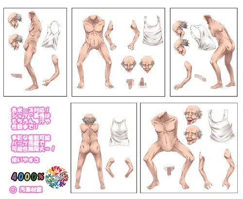 素材集にみんな大好きおじいちゃんの登場です! 世にも珍しい爺のアヘ顔、是非ご利用ください! 表情の切替や衣服・腕などの着脱が可能! 本体PSDファイルに加え、透過PNGファイルも多数同梱! 〜利用条件〜 商用利用⇒OK 同人利用⇒OK 加工利用⇒OK 使用報告⇒不要♪ 著作表示⇒不要♪ 素材としての頒布⇒NG 〜収録内容〜 ◆形式 PSDファイル ◆枚数 基本ポーズ5種類 ・正面 ・正面ななめ ・横 ・後ろ ・後ろななめ ◆サイズ 1800*2400px ◆解像度 300dpi ◆着脱・切替可能部位 ・シャツ ・表情 ・腕 ・性器 ・汗、よだれ ※後ろポーズはシャツの着脱のみ可能 ☆同梱透過PNG画像 ・基本ポーズ 38枚 ・顔アップ 18枚 ・性器単体 5枚