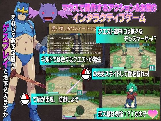 ストーリー ネクロマンサーの呪いにより暗雲に覆われ、廃墟と化しつつある交易都市アクアブルムに、 一人の剣士が現れた…その男の名は冒険者イカロス。戦う相手が女の子と見るや、容赦の ないエロ攻撃とゲスプレイで勝利する卑怯な戦略を武器に、主人公はアクアブルムの 様々な クエストに挑戦していく。 ■マウス操作により色んな角度で剣を振る攻撃や、盾での防御、アイテムの使用、 アタックスキルやエッチスキル等を駆使し、様々な敵と戦いながらクエストを攻略して いくインタラクティブアクションゲーム! ■ヒロインキャラとの戦闘中に使用できるエッチスキルには、相手の防御をかいくぐっての お触りや、イラマチオ、乳触り、股間&アナル愛撫、輪●やバイブ攻撃等があり、防御や 攻撃、命中や回避などの様々なステータス異常を起こし、戦いを有利に。 ■女剣士や道具屋の娘、ケモノ族や魔女、サキュバスや魔道士等の様々なキャラが用意されて おり、戦闘でヒロインキャラに勝利すると、相手を押し倒して様々な箇所にお触りしたり、 オウガズムがMAXになると射精やアクメ状態になり、フェラやパイズリ、アナル挿入等が 自由に行えるお触りモードに突入! ■ボイス有り、効果音有り、BGMあり。セーブ可能。エッチシーンを自由に閲覧 できるギャラリーモード有り。 CV ニコル、サキ、アンジェラ役:貴坂理緒 ニム、レベッカ、クインシス、シャルロット役:犬飼あお B・D、ナナコ、ヴィクトリア、ベロニカ役:秋葉モモ代 アラガキ博士、マラーク、デカリー、イカロス役:中島達也 滅びの街に現れた謎の変態剣士…彼が何者なのか、誰も知らない…… ※購入をご検討の際は、体験版にて動作チェックを行なってください。