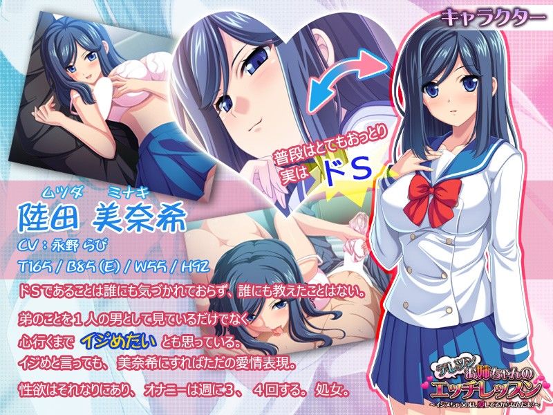 睦田美奈希(むつだみなき)は僕の恋人でも幼なじみでもなく、 普通に一緒に住んでる姉だ。 弟の僕が言うのも何だけど、完璧で魅力的な女性だ。 すごく丁寧に僕の面倒を見てはくれるのだけど、 妙に意地悪なところがあるお姉ちゃん。 最近はなんだか昔よりも 僕をイジってくることが多くなったような気がする……。 そんなある日、友人から無理やり押しつけられたSMもののAVを、 自分の部屋で興味本位に鑑賞していた時だった。 「洗濯物持ってきたから入るわよ〜……あら」 ドアを開けたお姉ちゃんと、僕の視線が合う。 ……下半身からアレが漏れ出したままで、 パソコンからの音声も流れっぱなしで……。 でも、お姉ちゃんはこんな状況なのに、 恥ずかしがることも嫌悪感を見せることもなく、 いつも僕にちょっと意地悪なことをする時のような微笑み混じりの顔になっている。 「そっか〜。こういうのに興味を示しちゃうくらいに成長しちゃったのか〜」 表情を崩さないまま、部屋から出るどころか僕のほうに近づいて…… えっ、な、なんでこっちにっ……? 「ふふっ……せっかくだから、気持ちいいこと、手伝ってあげる♪」 Microsoft社にてサポートが終了しているWindowsOS については、 下記の公式サポート窓口へお問い合わせください。 ■ アパタイト サポートフォーム