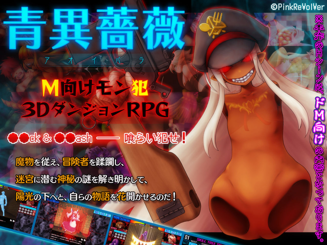 M向けモン犯3DダンジョンRPG ●●ck&●●ash――喰らい犯せ! 魔物を従え、冒険者を蹂躙し、迷宮に潜む神秘の謎を解き明かして、 陽光の下へと、自らの物語を花開かせるのだ! ■■■ 解説 ■■■ 本作は、幣サークルオリジナルの、3DダンジョンRPGです。 プレイヤーであるあなたの手で、主人公の「青異薔薇(あおいばら)」を操作し、迷宮からの脱出を目指すのが、目的となります。 迷宮には、徘徊する魔物や冒険者との戦闘や謎解きが待ち構えており、行く手を阻んできます。 次々に現れる強敵を打ち倒し、青異薔薇を――血肉を食らって支配した魔物を成長させ、探索を進めていきましょう。 ■■■ M向けモン犯 ■■■ 魔物を仲間に加えた状態で、冒険者を倒す事で、ドM向けな男性被虐のHシーンが繰り広げられます。 仲間へと加えられる基礎24種の魔物全てにHシーンは用意されており、様々なシチュエーションをお楽しみ頂けます。 魔物に冒険者をH(蹂躙)させる事で、強力なスキルを覚え、戦闘を有利に進められる様になります。 24体の魔物を、支配下に置き、戦闘の矢面へと立たせ、冒険者を襲う事が可能です。 ・妖魔系:ゴブリン・フェアリー・インプ・マーメイド・ラミア・アラクネ ・亜人系:オーク・エルフ・リザードマン・ドワーフ・オーガ・サイクロプス ・怪奇系:ゴースト・スケルトン・スライム・マミー・ゴーレム・パペットマスター ・魔性系:ワーバニー・妖狐・マンイーター・エンジェル・デビル・触姫 ■■■ 難度:程よい歯ごたえとスピーディーな展開 ■■■ 全ての謎に、ヒント等は用意されており、理不尽な総当たり等は必要の無い設計となっております。 成長に関しても、時折レベル(ランク)上げを行う程度で、平均的な強さの敵は倒せる程度に調整してあります。 また、オートマッピングや罠感知の他、戦闘スピードの向上等、攻略に役立つスキルも習得&状況に合わせて設定可能です。 ■■■ 概要 ■■■ ・HCG枚数:基本CG24枚(差分多数) ・CG&シーン&BGM&立ち絵鑑賞(魔物図鑑)、有り。