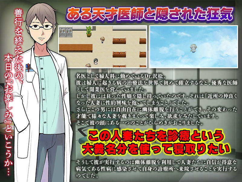 医者として人妻を合法的に犯しまくれ! 鬼畜診療を行う狂った人妻寝取り系鬼畜診察ゲーム! <ある天才医師と隠された狂気> 名医として婦人科に勤めているDr.沢松。 彼は婦人に起きる病の治療法を世界で初めて確立するなど、優秀な医師として開業医を営んでいました。 しかし彼には狂った性癖を隠し持っていたのです。 それは「近所の仲良くなった人妻に性的興味を抱いてしまうこと」でした。 さらにこの男には自由自在に幽体離脱を行うことができ、その変わった才能で様々な人妻を覗きまくって楽しみ、欲求をみたしています。 そこで彼の頭にある一つのことがひらめきがおこりました。 ――この人妻たちを診療という大義名分を使って寝取りたい――と そうして彼が実行するのは幽体離脱を利用して人妻たちに自信が得意な病気である性病に感染させて自身の診療所へ来院させることを実行するのでした。 <狂気のコンセプト> Dr.沢松が主に行動するのは幽体離脱を使用して油断した人妻たちを覗くこと・ その覗きで見つけた人妻たちが油断しているところを狙い、遠隔的に性病の感染をさせて自身の婦人科に来院するように謀ります。 また主人公の沢松は外面に対しては名医かつ聖人君子として通っていますが、卑劣な性癖や覗き趣味は隠している状況で、その性癖を隠しながら人妻を寝取っていく鬼畜診察ゲームです。 <鬼畜診察> まずは幽体離脱を行える能力を駆使して街を自由に散策するところから始まります。 そうしてターゲットの人妻に侵入し、彼女たちの夫にも見せたことのない痴態を楽しんでいきましょう。 その中で油断しすぎている人妻に対しては、自身の病院に来院してもらうために性病の病原菌を感染させることが可能です。 また、その感染させた人妻が自身の婦人科に来た際には卑劣なエッチが行われることになります。 おとなしめの人妻、プライドの高い高飛車な人妻…ふわふわ系や箱入り娘系、人妻の娘などなど個性豊かな人妻ヒロインたちを寝取り、屈辱的な診療をして楽しんでいきましょう! <特別鬼畜診療> 屈辱的な特別鬼畜診療を施していくことが可能です。 特別鬼畜診療を行うためには、まずは幽体離脱で性病感染をさせた人妻たちを来院させます。 その際に胎内視姦はもちろん、改造クリ責め、母乳プレイ、フィストファックなど過激で屈辱的な診療プレイを行います。 主人が見守る人妻をあられもない姿にして屈服させ、視姦拷問を楽しみます。 様々な人妻や娘たちを自身の性欲をぶつけ、屈辱的で利己的な診療を行っていきましょう。